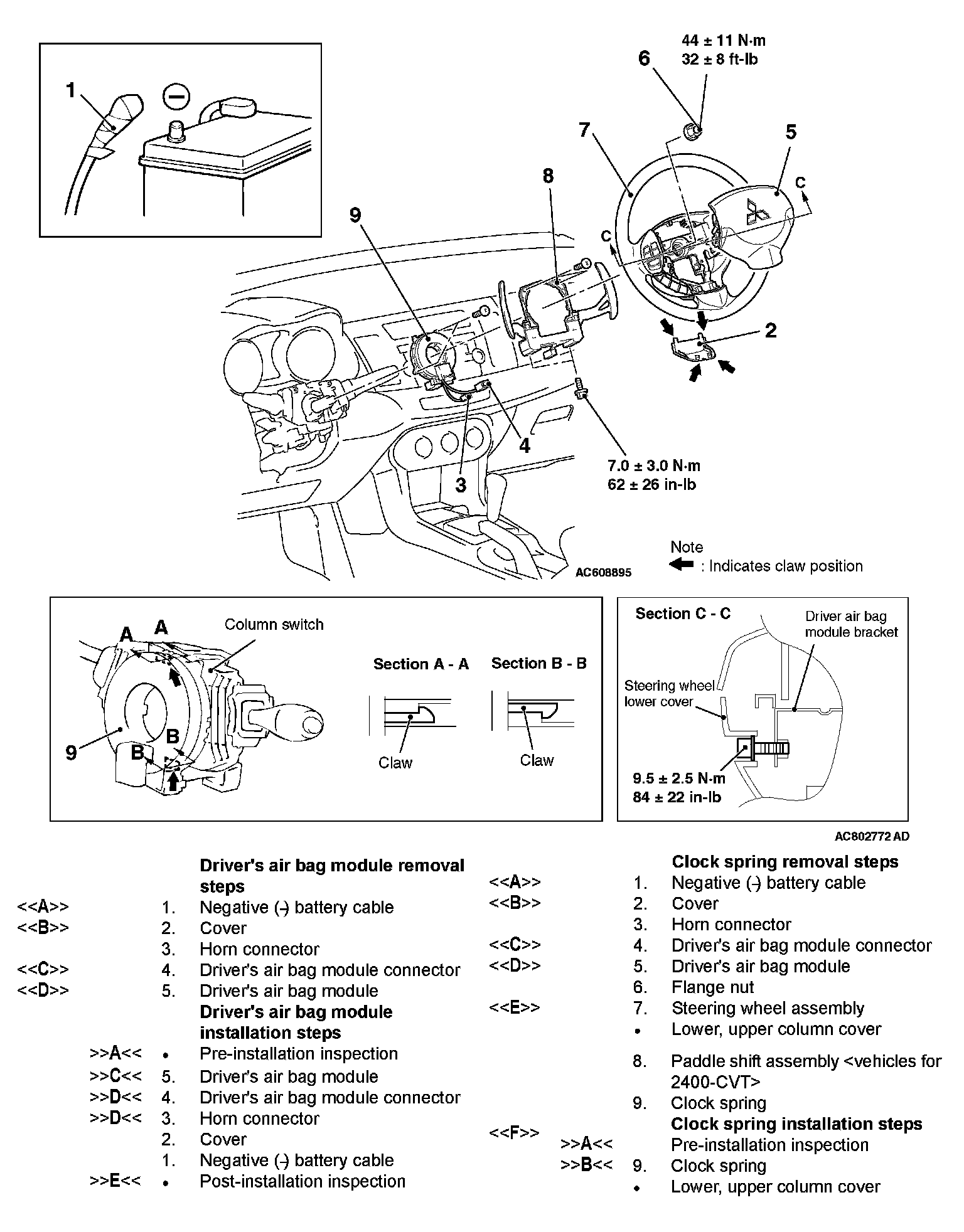 - Never attempt to disassemble or repair the air bag modules or clock spring. If faulty, replace it.