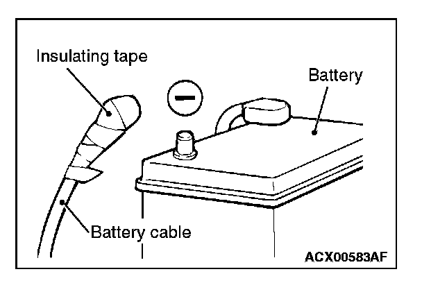 6. Turn the ignition switch to the "LOCK" (OFF) position. Disconnect the negative (-) battery cable and tape the terminal to prevent accidental connection and air bags deployment.