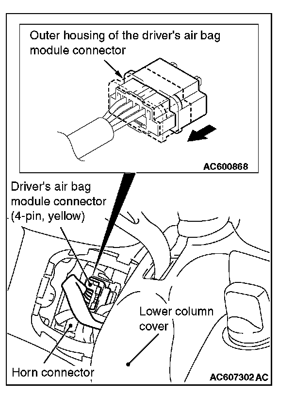 Slide the outer housing of the driver s air bag module connector in the arrow direction shown, and disconnect the connector.