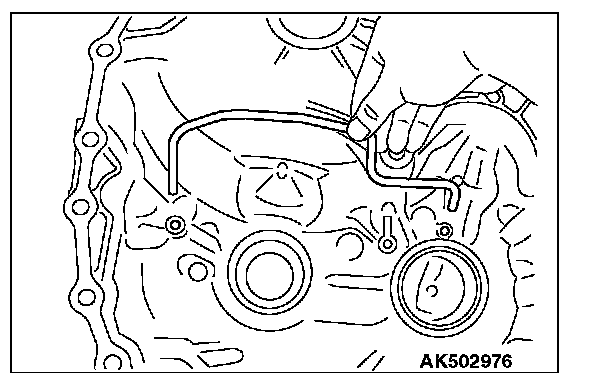 31. Install the oil pump on the transaxle case and tighten the bolt to the specified torque. (One fastening bolt is installed at the backside from the transaxle case side. Only this bolt should be tightened to the specified torque of 28 Nm [21 ft-lb]).