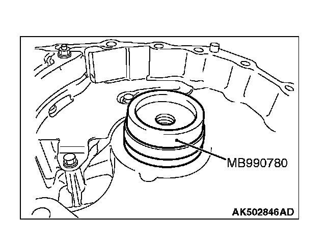 24. Using the special tool MB990780, install the outer race of differential side bearing on the transaxle case.
