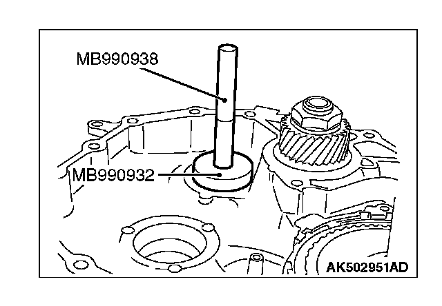 25. Using the special tools MB990932 and MB990938, install the outer race of reduction gear bearing on the converter housing.