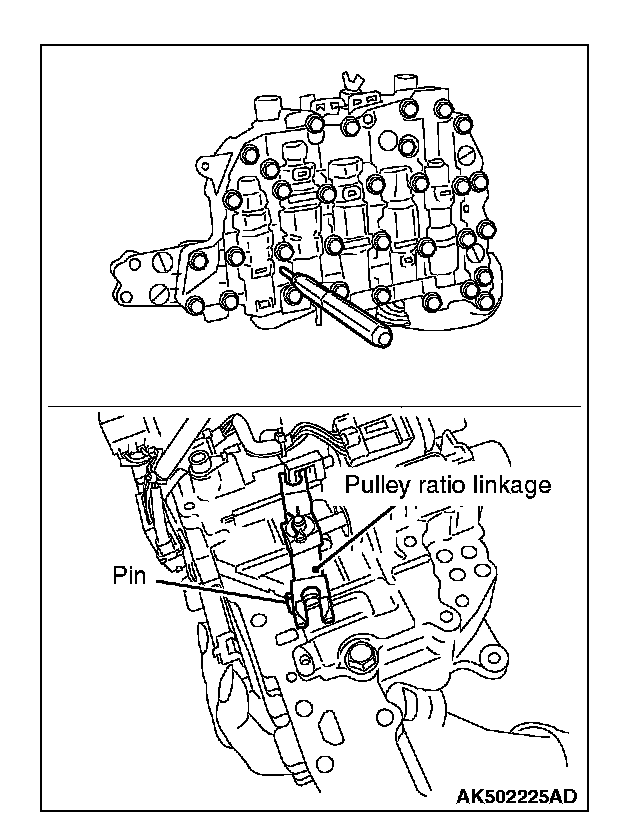 1) Insert pins etc. [diameter] 3 mm (0-12 in)) into linkage stopper holes of the control valve assembly to fix the pulley ratio linkage.