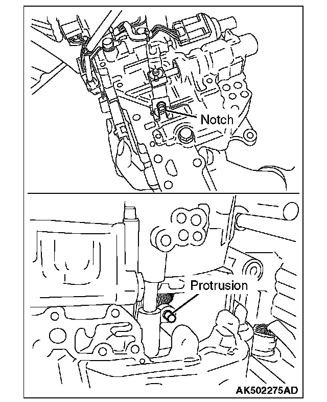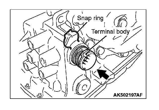 2) Install the terminal body on the transaxle case, while aligning the detent of terminal body with the transaxle case as shown in the diagram.