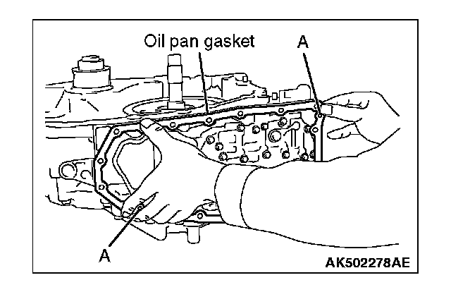 ^ When installing the oil pan gasket, align the dowel pins of transaxle case with dowel pin holes A of the oil pan gasket.