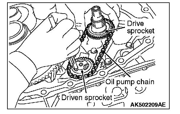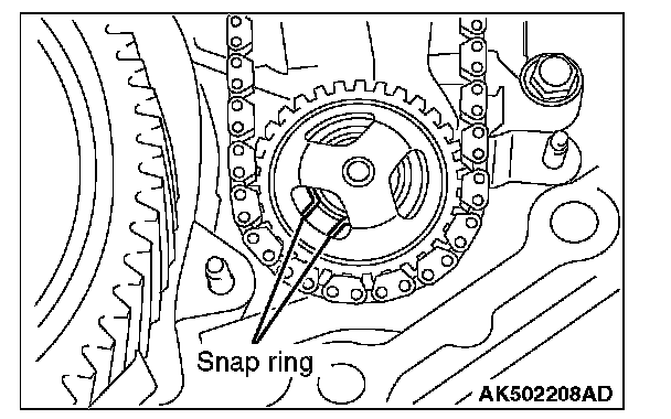 49. Expand the snap ring, and install the driven sprocket, oil pump chain, and drive sprocket.