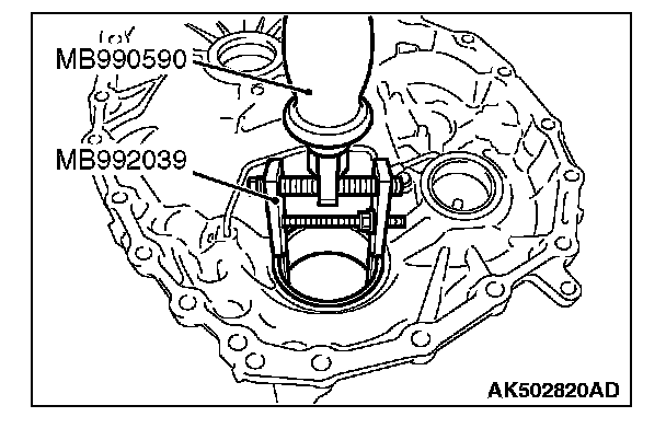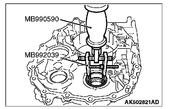19. Using the special tools MB990590 and MB992039, remove the outer race of differential side bearing from the converter housing.