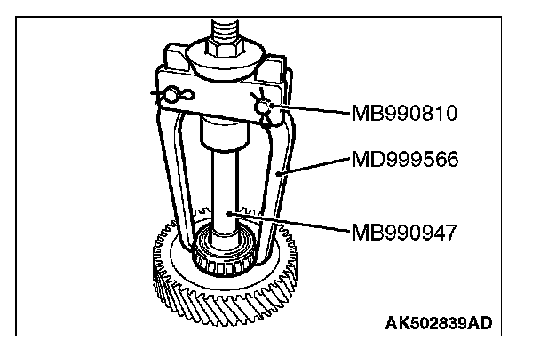 Using the special tools MB990810, MB990947 and MD999566, remove the inner race of reduction gear bearing (converter housing side) from the reduction gear sub-assembly.