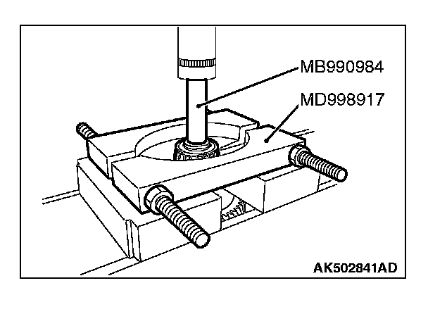 Using the special tools MB990984 and MD998917, remove the outer race of reduction gear bearing (transaxle case side) from the reduction gear sub-assembly.