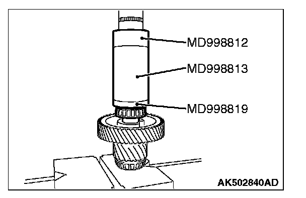 Using the special tools MD998812, MD998813 and MD998819, install the inner race of reduction gear bearing (transaxle case side) on the reduction gear sub-assembly.