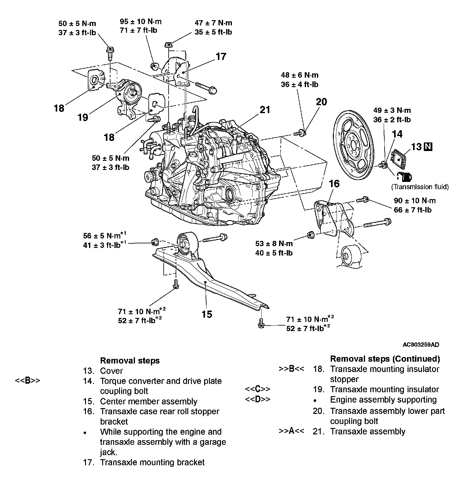 ^ The part indicated by the *1 mark should be temporarily tightened, and then fully tightened with the engine and transaxle assembly weight applied on the vehicle body.