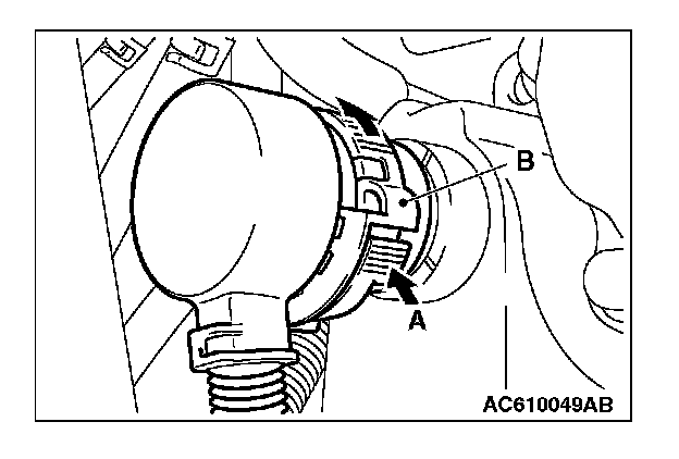 While pressing A in the figure, turn B counterclockwise to unlock the CVT assembly connector, and disconnect the connector.