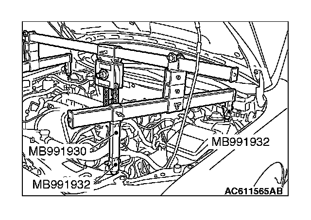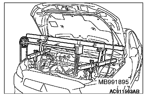 1) Set the foot of the engine mechanical hanger (Special tool: MB991895) as shown in the figure.