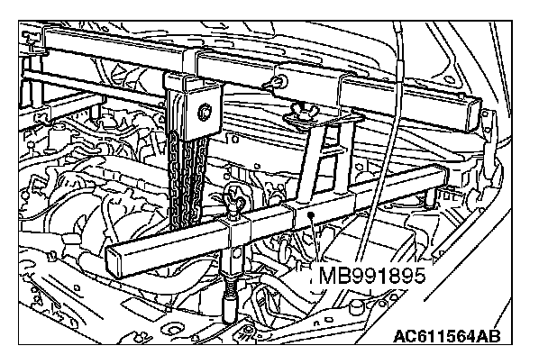NOTE: Slide the front foot of the engine mechanical hanger (Special tool: MB991895) to balance the engine hanger.