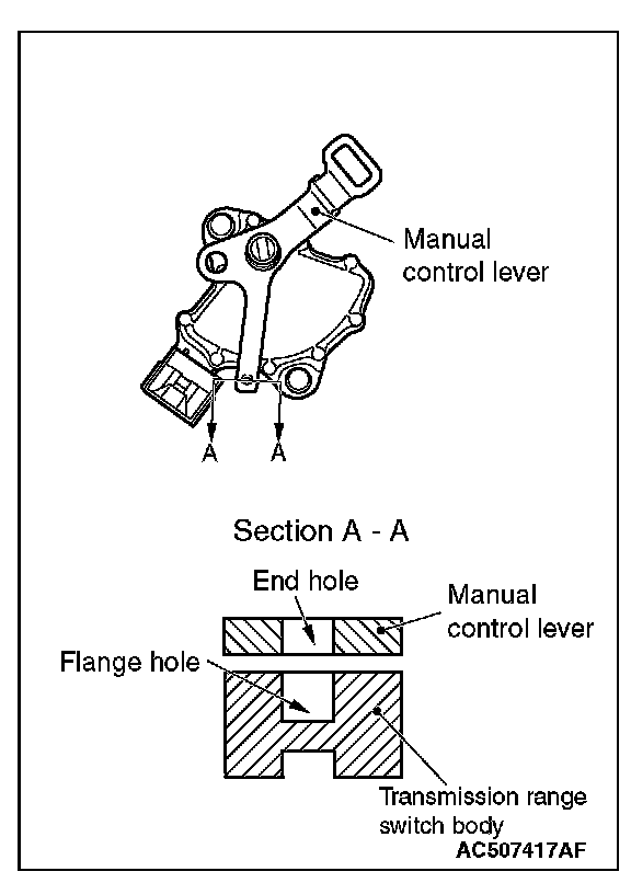 3. Align the hole at the end of the manual control lever and the hole in the inhibitor switch body flange (section A-A).