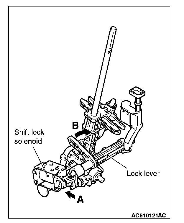 Check that the lock lever smoothly moves in the direction of arrow B in the figure when the shift lock solenoid plunger is pressed in the direction of arrow A, and smoothly moves back to the original position when the plunger is released.