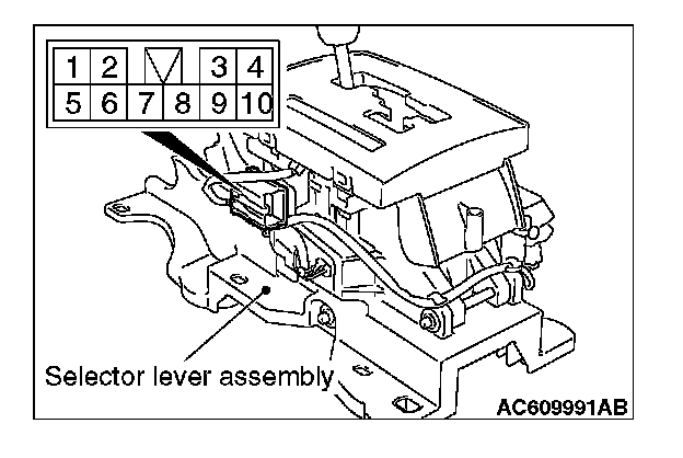 2. Using a jumper wire, connect the battery (+) to the selector lever assembly connector terminals No.3 and No.4, and the battery to the terminal No.6. Then, check the operation of shift lock solenoid.