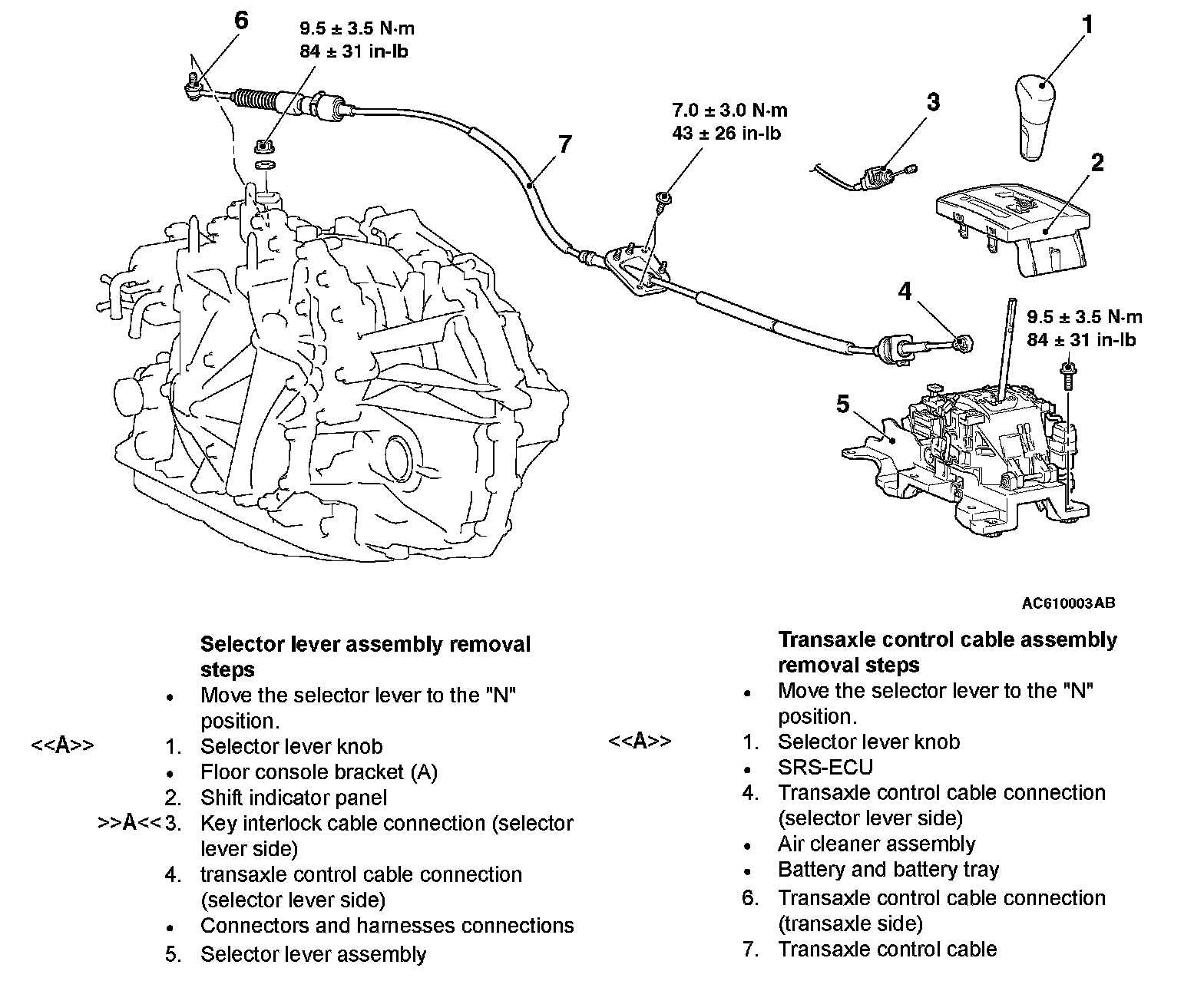 Be careful not to subject the SRS-ECU to any shocks during removal and installation of the transaxle control cable assembly.