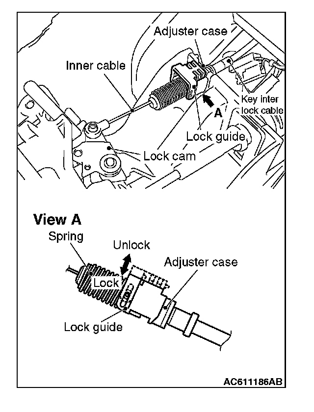2. Install the tip of the key interlock cable to the lock cam of the selector lever assembly, taking care not to twist the inner cable.
