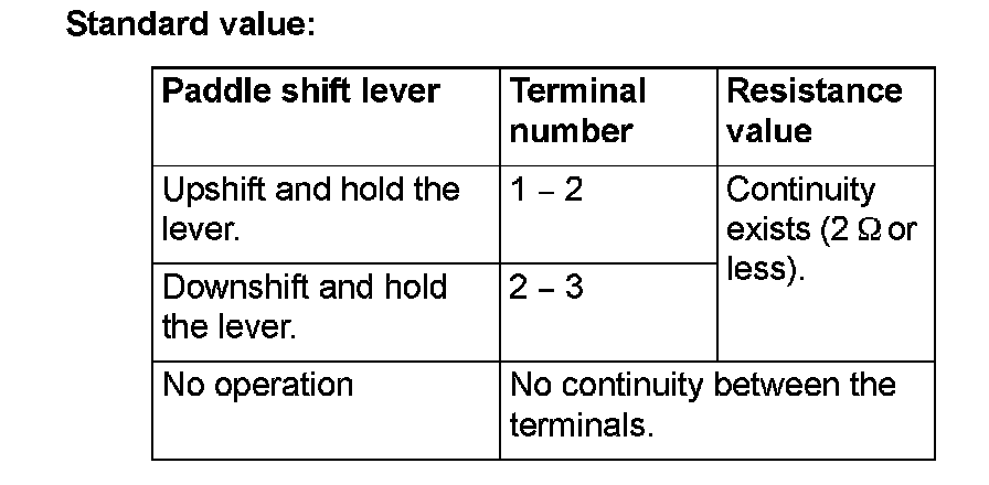 1. Check that the paddle shift lever is returned to the original position quickly when the lever is released after operation of the paddle shift lever (±side) (pulling to the rear side of the vehicle). In addition, check for abnormal looseness, friction and abnormal noise.