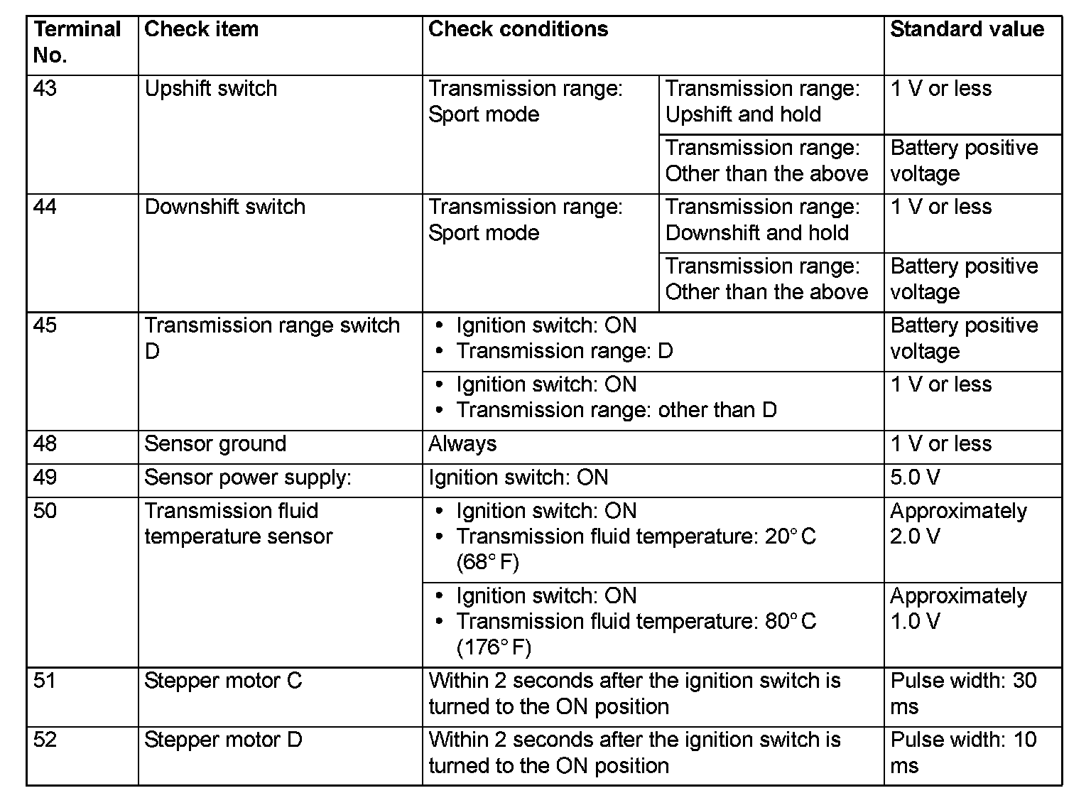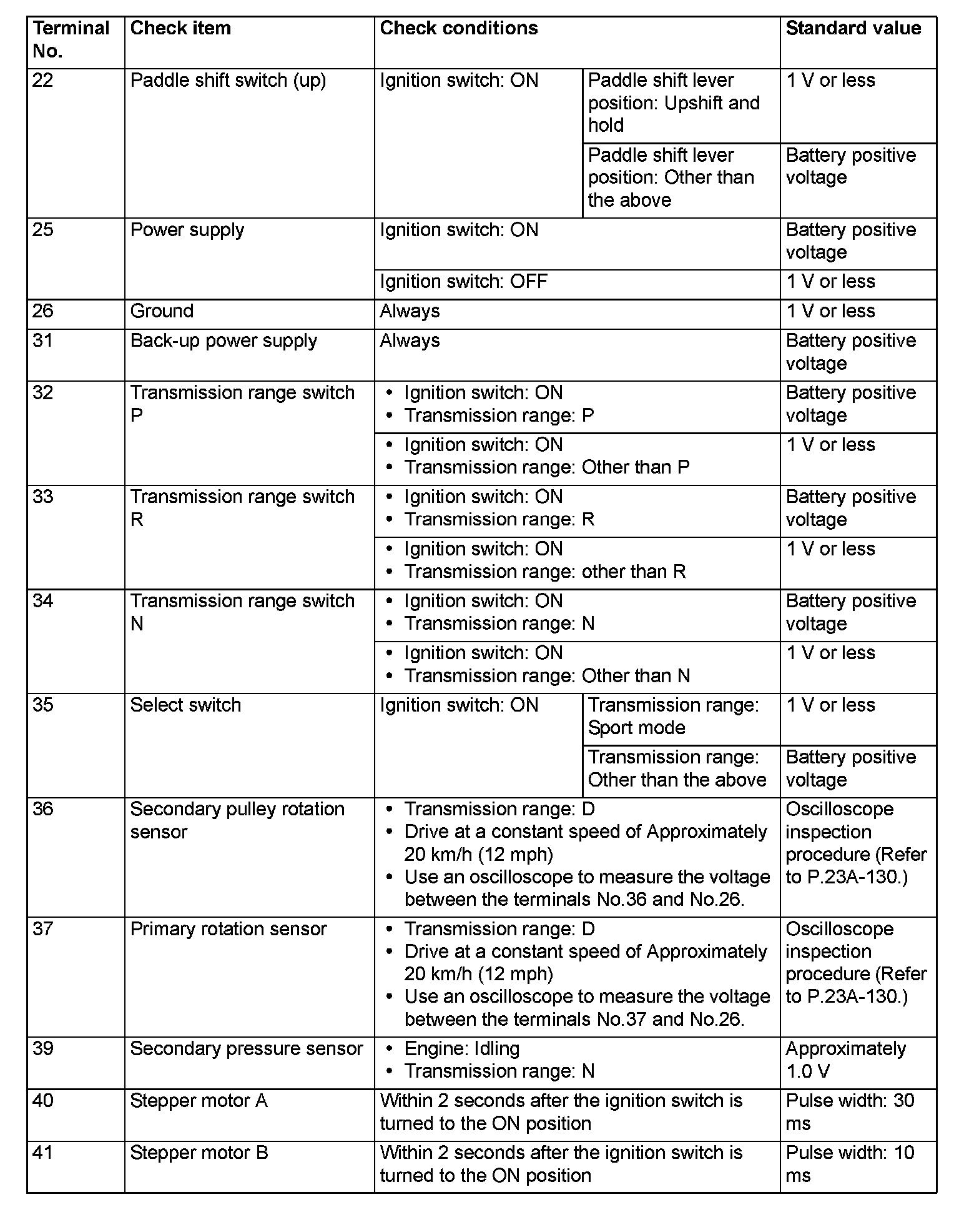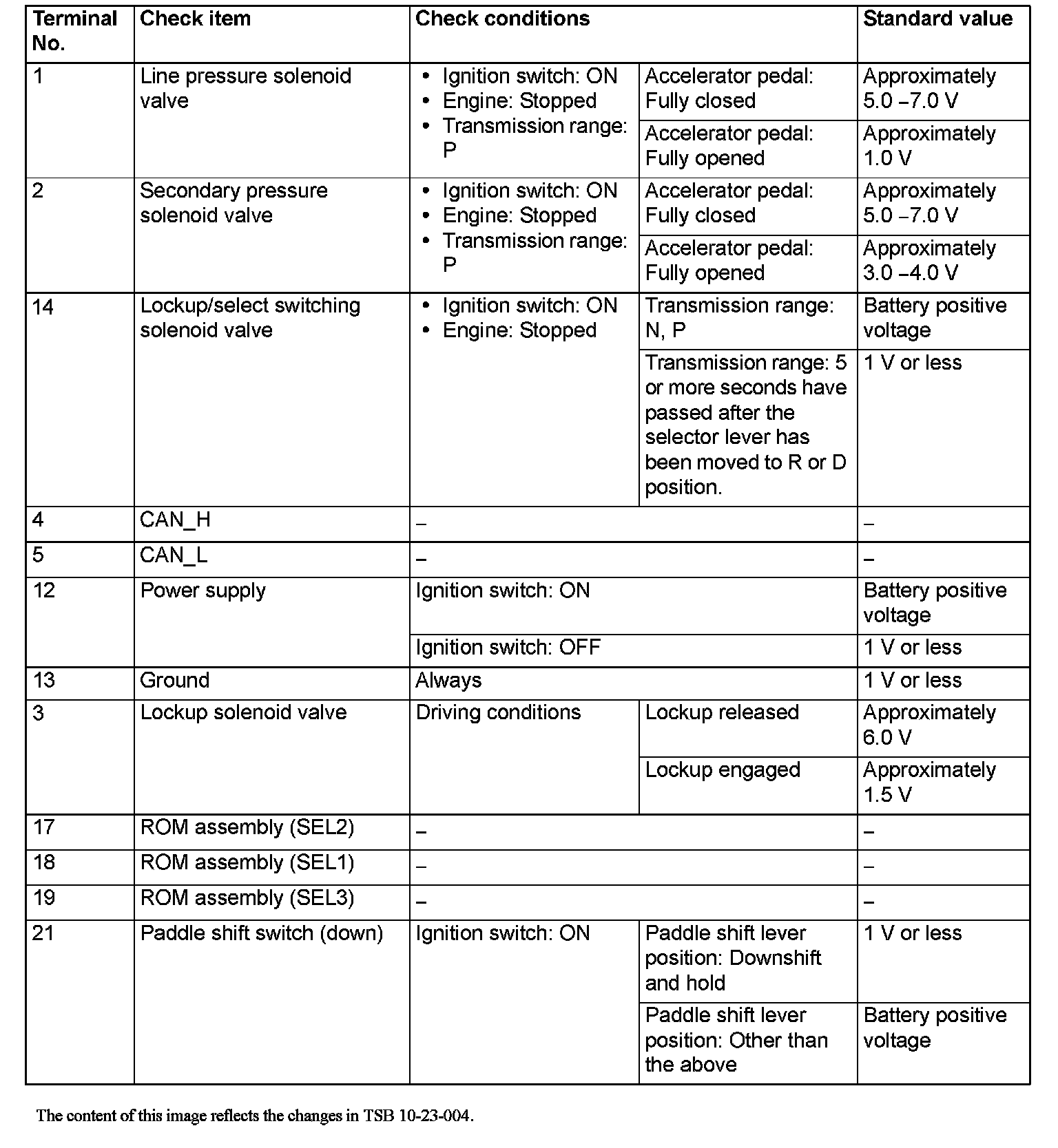TERMINAL VOLTAGE REFERENCE CHART FOR TRANSAXLE OPERATION