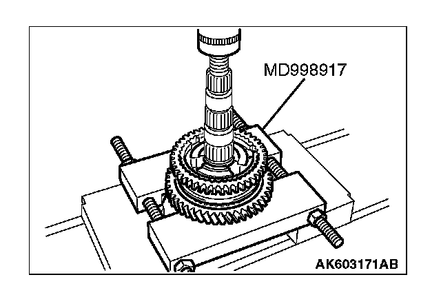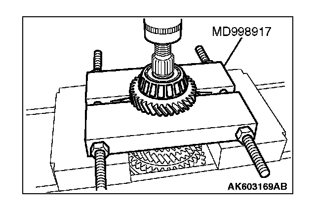 Using special tool MD998917, support the 4th drive gear and remove the tapered roller bearing Inner race and 4th drive gear.