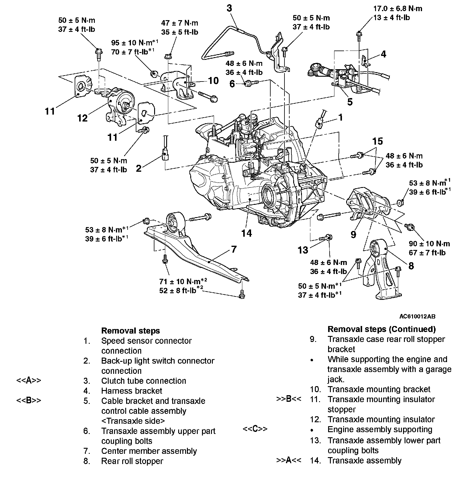 ^ The part indicated by the *1 mark should be temporarily tightened, and then fully tightened with the engine and transaxle assembly weight applied on the vehicle body.
