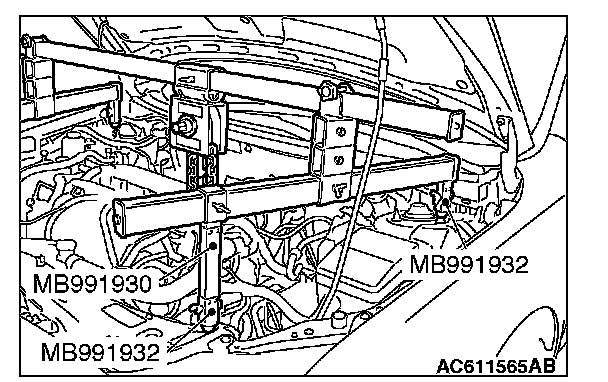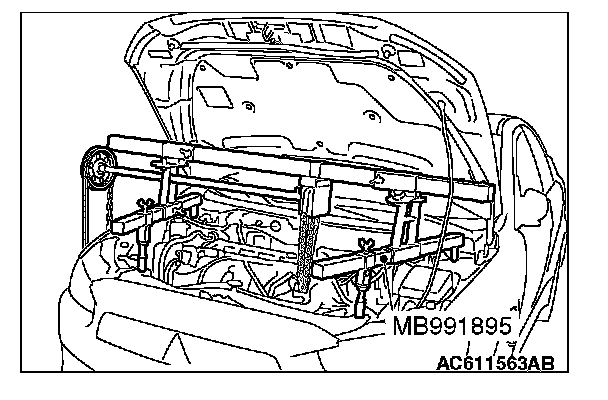 1) Set the foot of the engine mechanical hanger (Special tool: MB991895) as shown in the figure.
