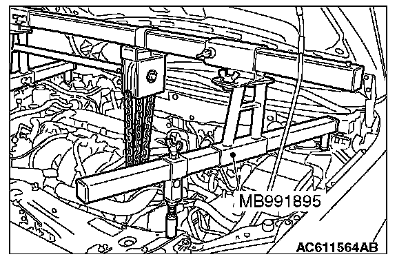 NOTE: Slide the front foot of the engine mechanical hanger (Special tool: MB991895) to balance the engine hanger.