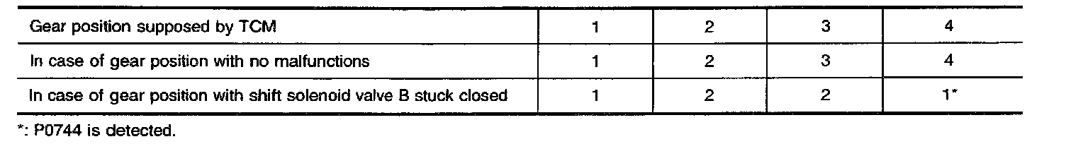 If the actual gear position is much lower than the position (4th) supposed by TCM, the slip ratio will be much less than normal. In case the ratio does not reach the specified value, TCM judges this diagnosis malfunction.
