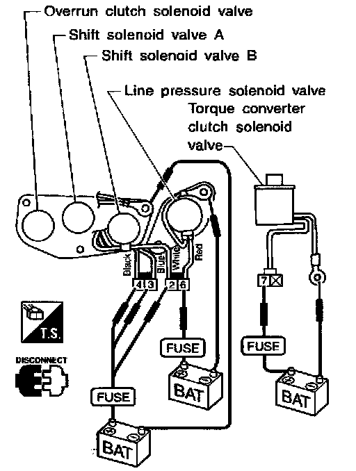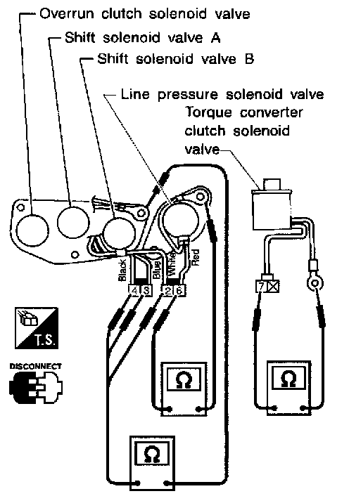 - Check solenoid valve by listening for its operating sound while applying battery voltage to the terminals (6 or 7) and ground.