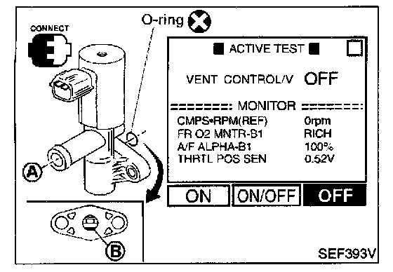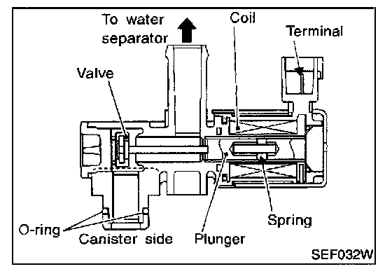 This solenoid valve responds to signals from the ECM. When the ECM sends an ON signal, the coil in the solenoid valve is energized. A plunger will then move to seal the canister vent. The ability to seal the vent is necessary for the on board diagnosis of other evaporative emission control system components.