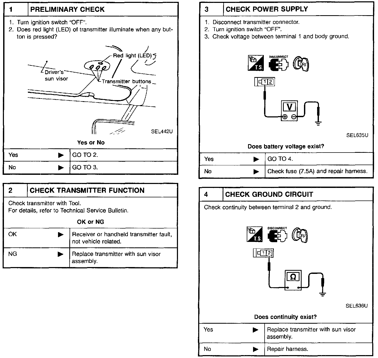 Before conducting the procedure given below, make sure that system receiver (garage door opener, etc.) operates with original hand-held transmitter. If NG, receiver or hand-held transmitter is at fault, not vehicle related.
