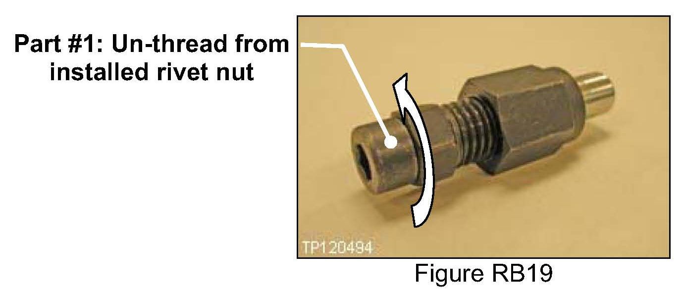 3. Thread a rivet nut onto part #1 until it bottoms out no more than finger tight (see Figure RB16).
