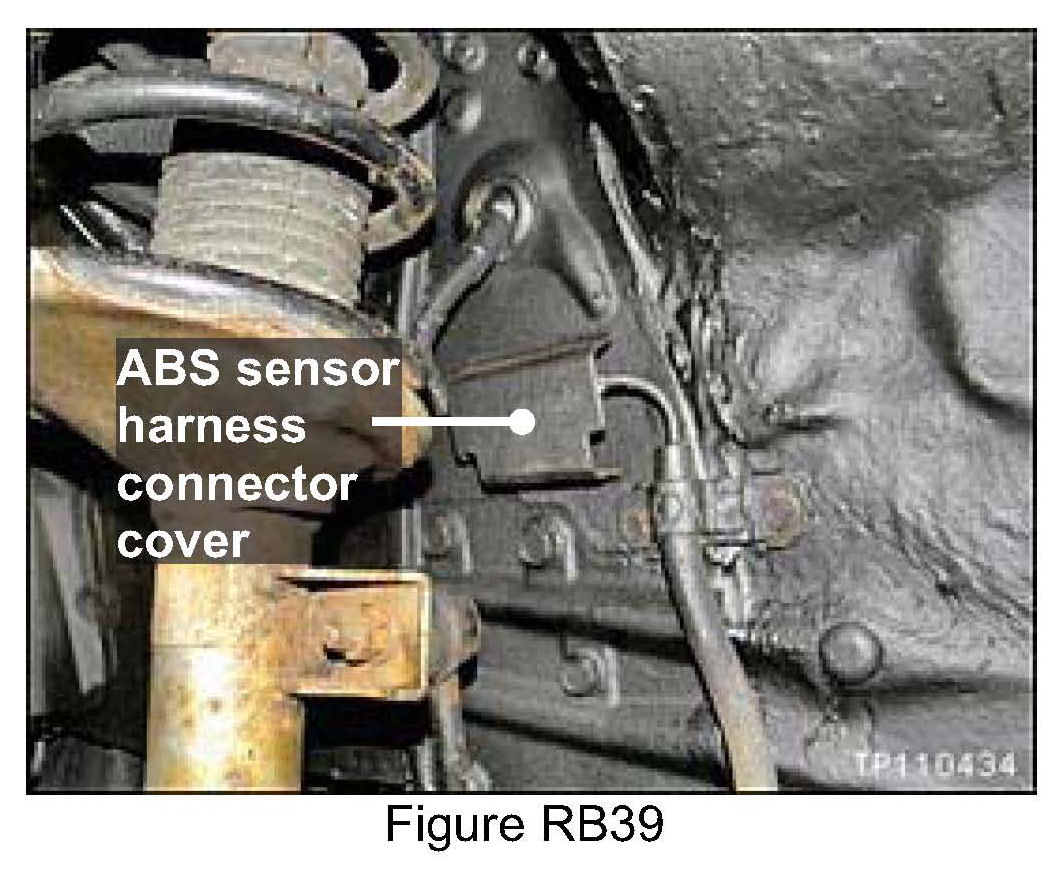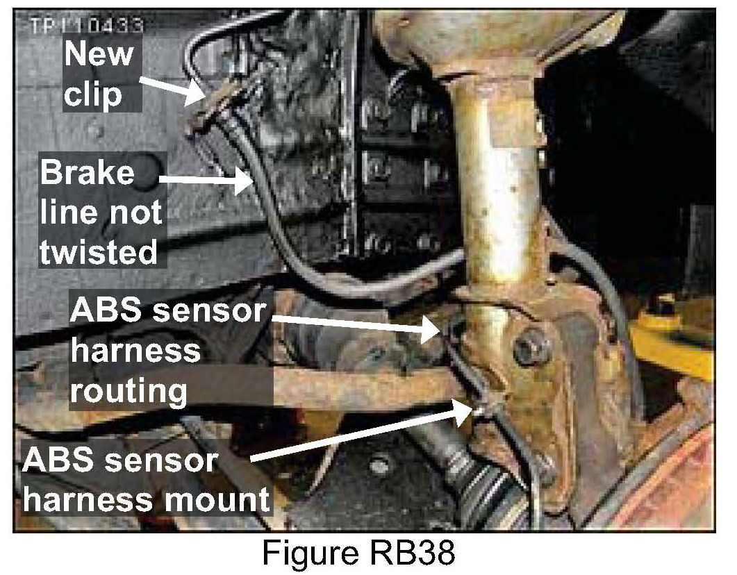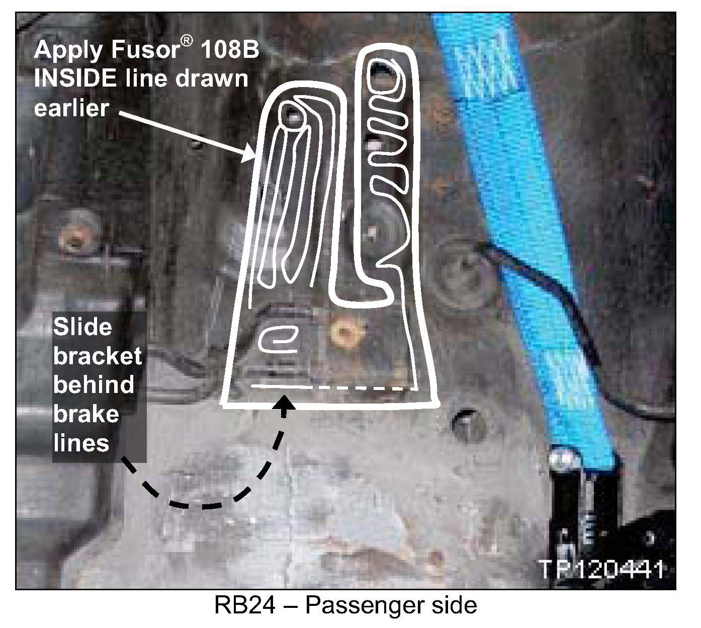 38. Driver side: Apply Butyl Sealer (P/N B6553 - 89915) around the opening for the ABS sensor harness (see Figure RB31).