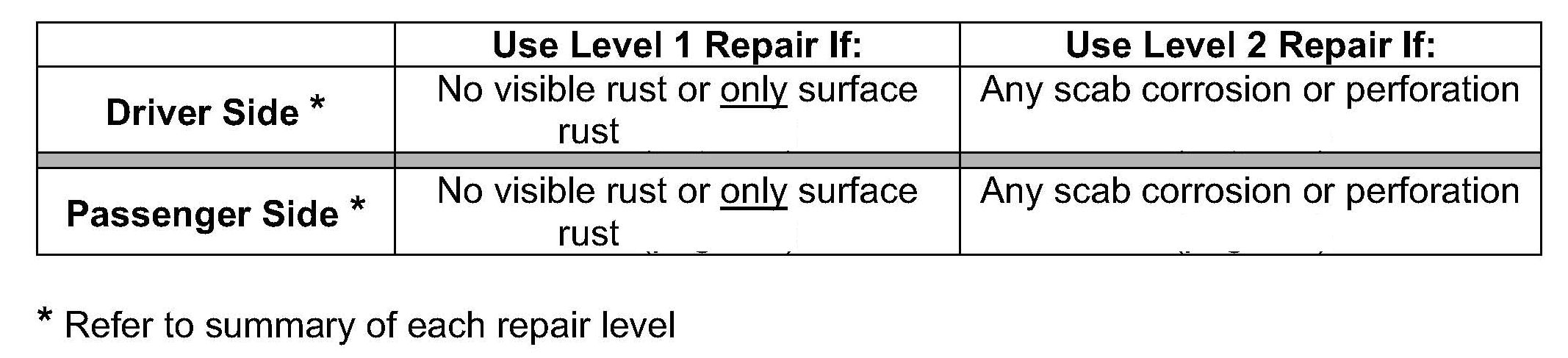 If there is no perforation in Area 1 and no scab corrosion in Area 2 on the driver side OR passenger side, the vehicle is repairable.