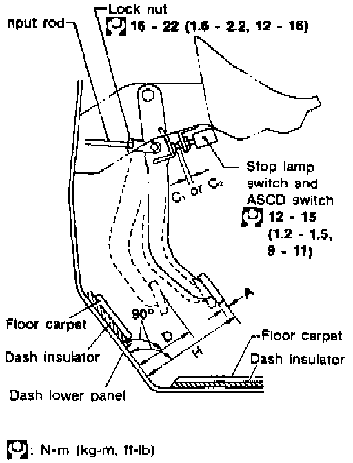 - C1, C2: Clearance between pedal stopper and threaded end of stop lamp switch and Automatic Speed Control Device (ASCD) Switch: 0.3 - 1.0 mm (0.012 - 0.039 inch)