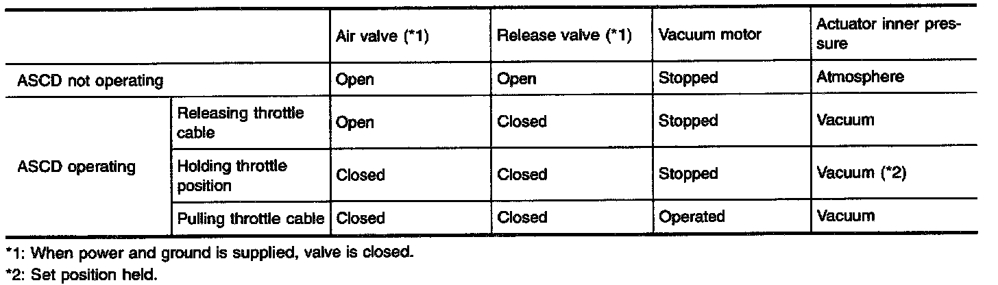 Ground is supplied to vacuum motor, air valve and release valve from ASCD control unit depending on the operated condition as shown in the below table.