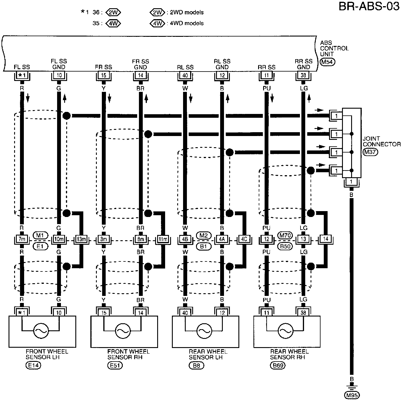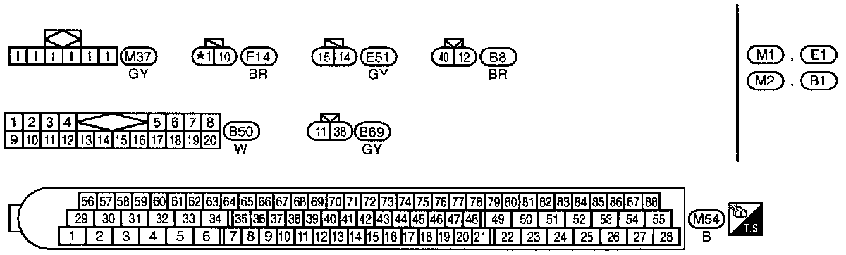 B1, E1, M1, M2 Body, Engine and Main Harness Terminal Arrangements