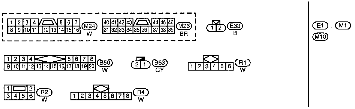 E1, M1 Body, Engine and Main Harness Terminal Arrangements