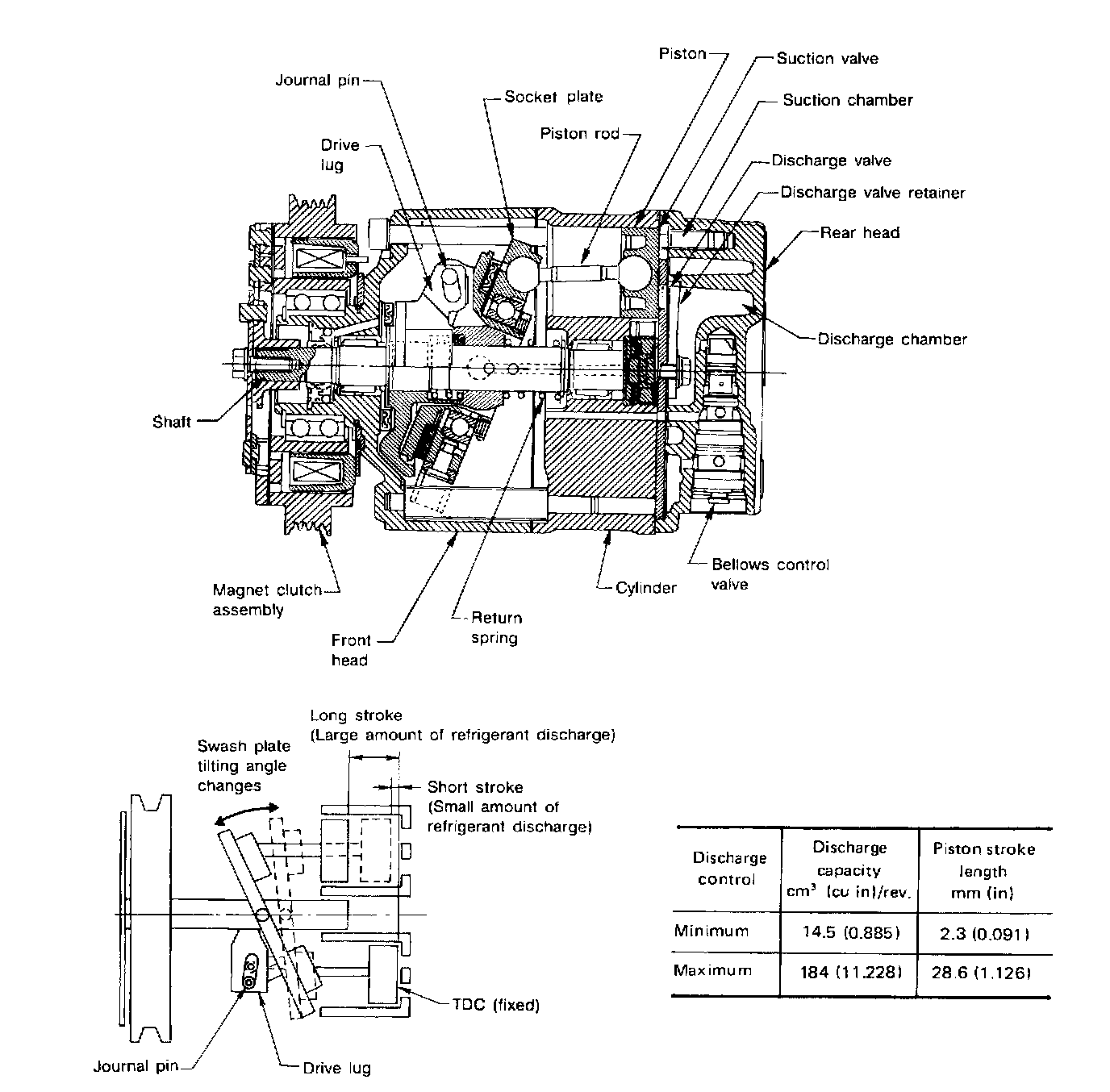 The tilt of the swash plate allows the piston's stroke to change so that refrigerant discharge can be continuously changed from 14.5 to 184 cu.cm (0.885 to 11.228 cu in).