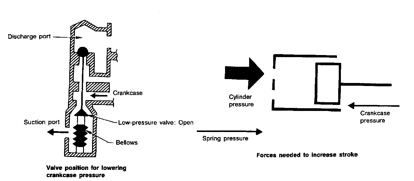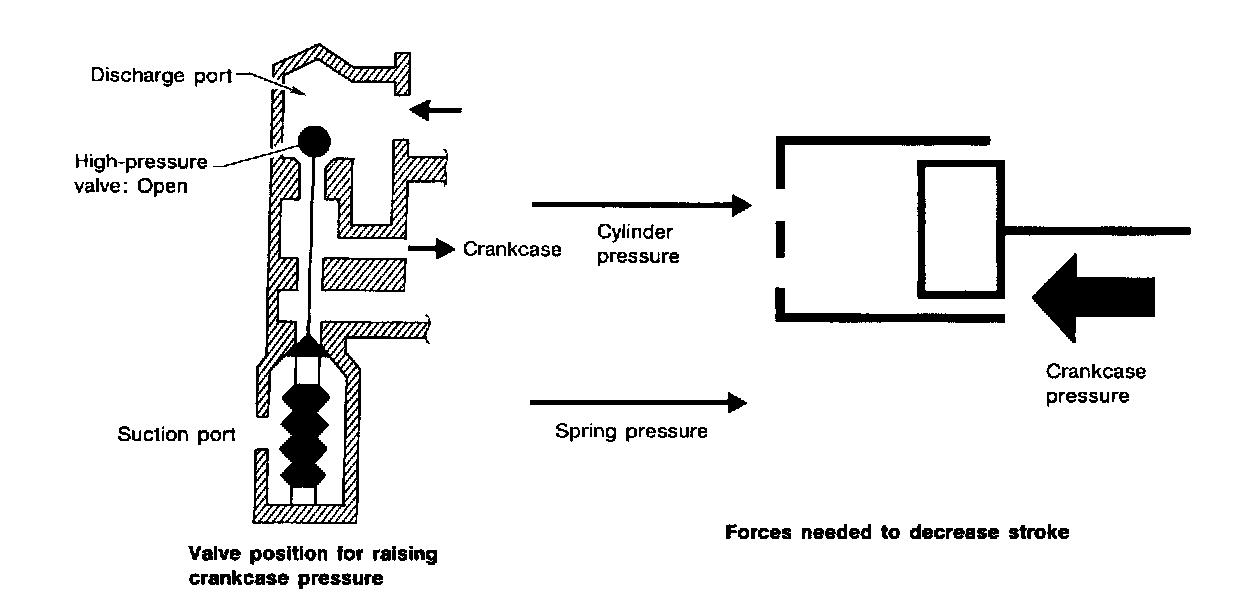 The angle of the swash plate is controlled between the crankcase's internal pressure and the piston cylinder pressure.