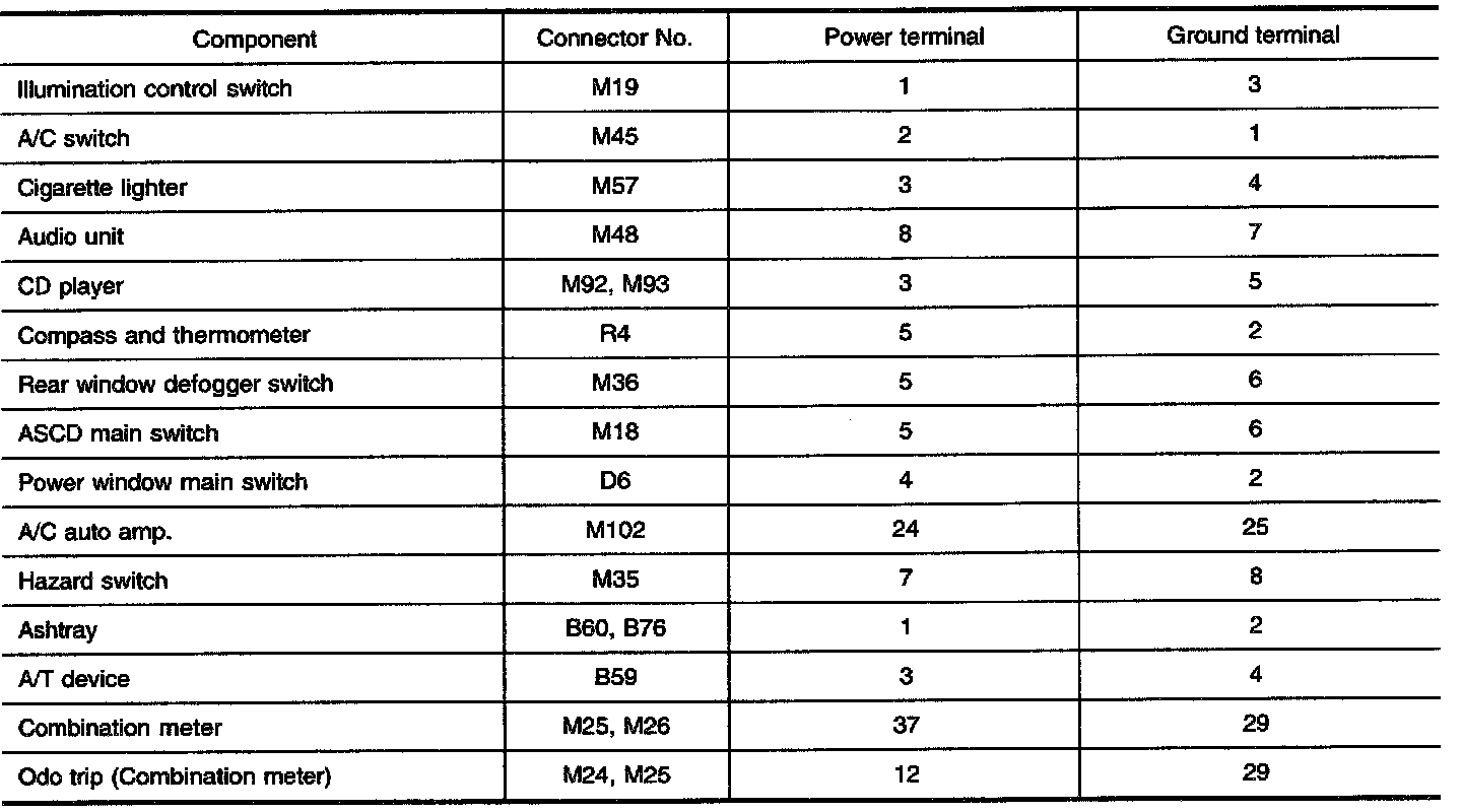 The ground for all of the components except for compass, thermometer and ashtray are controlled through terminals 2 and 3 of the illumination control switch and body grounds M77 and M111.