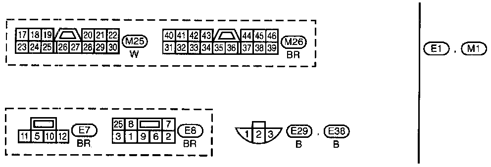 E1, M1 Body, Engine and Main Harness Terminal Arrangements