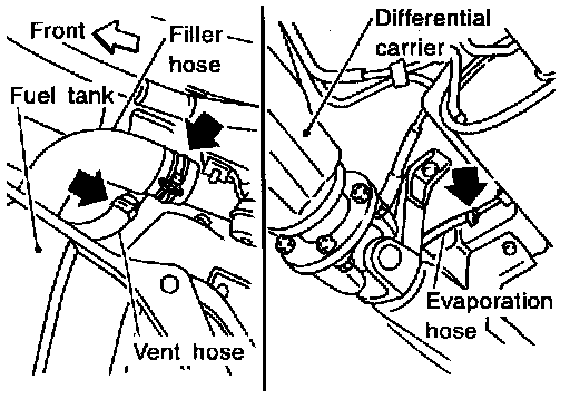 5. Disconnect filler hose, vent hose and evaporation hose at fuel tank side.