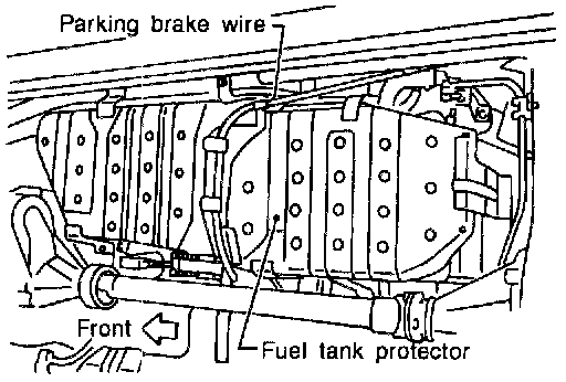 6. Remove parking brake wire from fuel tank protector.