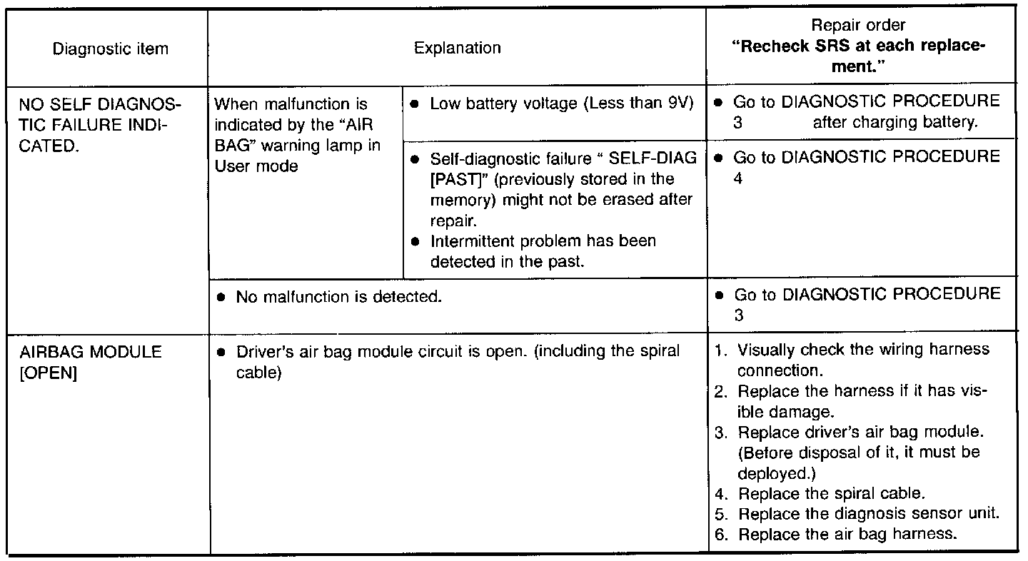 If no self-diagnostic failure is detected on "SELF-DIAG-CURRENT]" even though malfunction is detected in "SRS Operation Check", check the battery voltage. If the battery voltage is less than 9 V, charge the battery. Then go to DIAGNOSTIC PROCEDURE 3. If the battery voltage is OK, go to DIAGNOSTIC PROCEDURE 4, to diagnose the following cases: