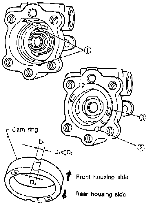 - Insert pin No. (2) into pin groove No. (1) of front housing and front side plate. Then install cam ring No. (3) as shown.