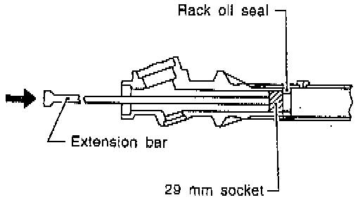 11. Remove rack bushing and rack oil seal using tape wrapped socket and extension bar.