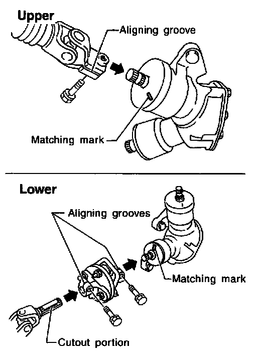 5. When attaching steering column upper and lower joint to transfer gear, it must be positioned as shown in figure at left.